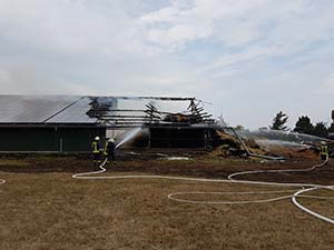 Der Teil mit der Strohernte konnte nicht mehr gerettet werden und brannte vollständig aus. Die Brandausbreitung auf die andere Hälfte der Halle sowie auf ein trockenes Maisfeld konnten verhindert werden.
