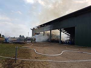 Der Teil mit der Strohernte konnte nicht mehr gerettet werden und brannte vollständig aus. Die Brandausbreitung auf die andere Hälfte der Halle sowie auf ein trockenes Maisfeld konnten verhindert werden.